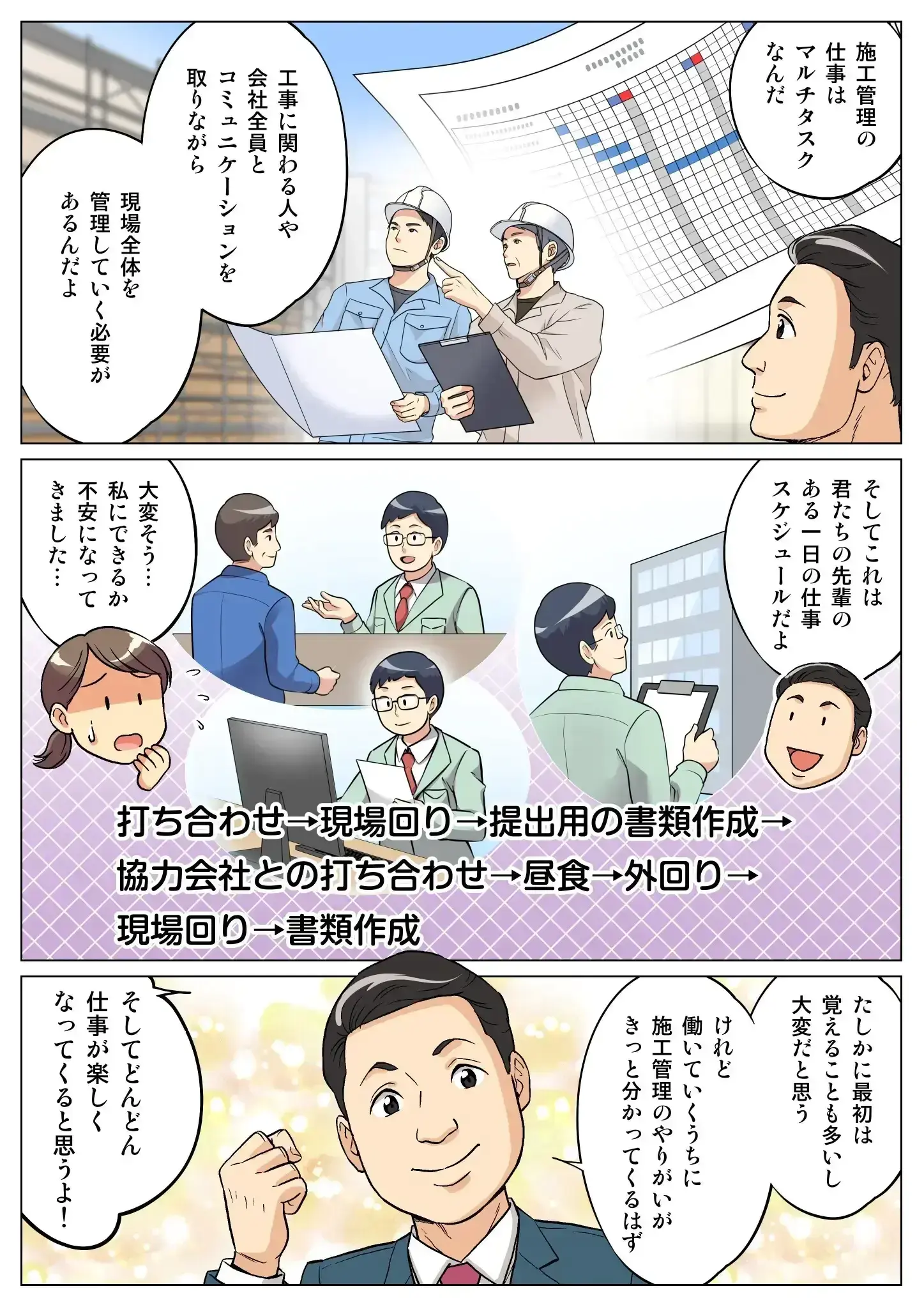 予定通りに工事を進めるために欠かせない業務です。作業の進め方だけでなく、作業員の数や重機の手配、進捗状況のチェックなども含まれます。